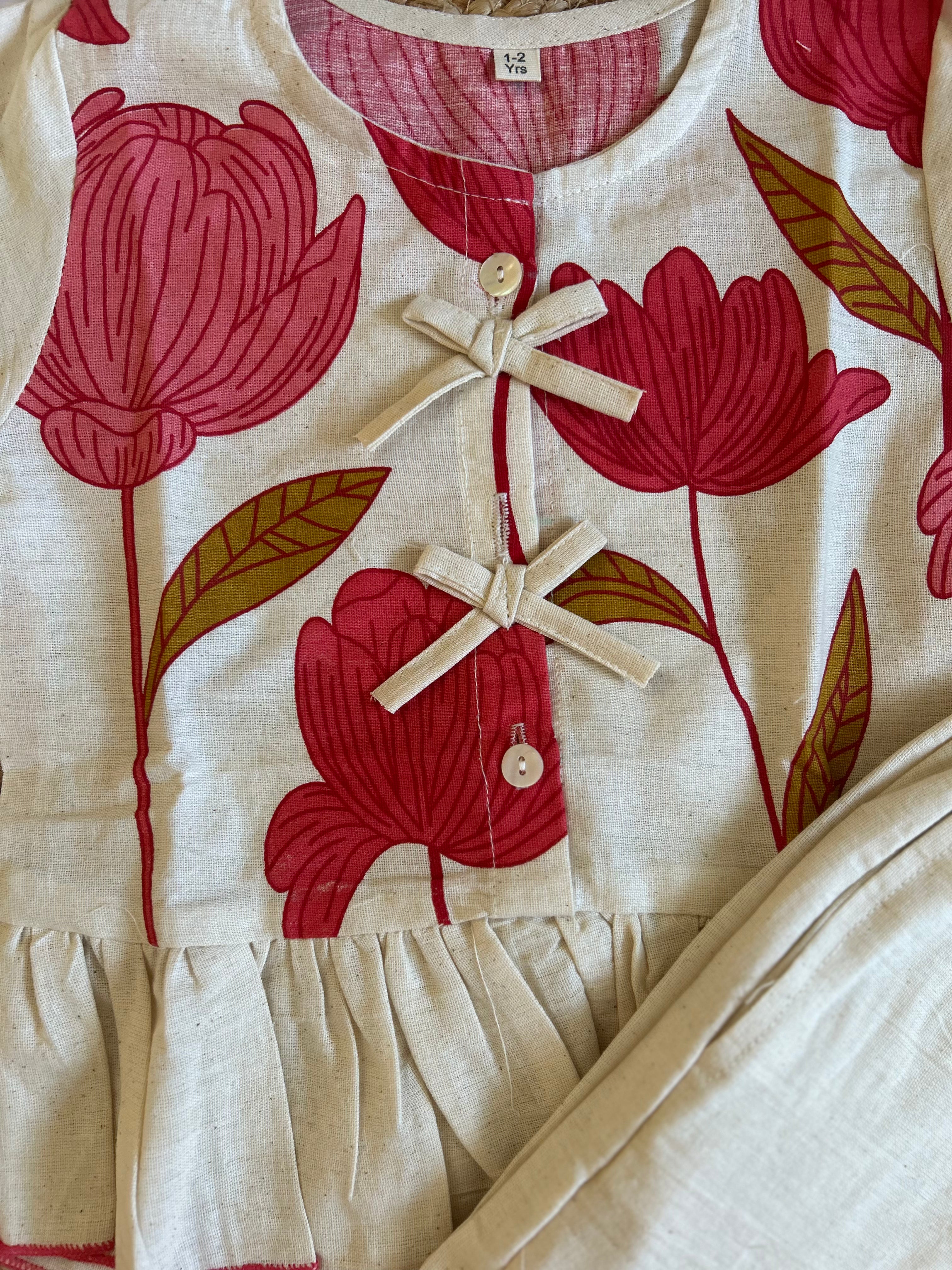 A charming floral co-ord set designed in vibrant pink lotus prints that brighten up your little one’s day. The peplum top is detailed with cute bows and soft gathers, while the printed pants ensure all-day comfort.