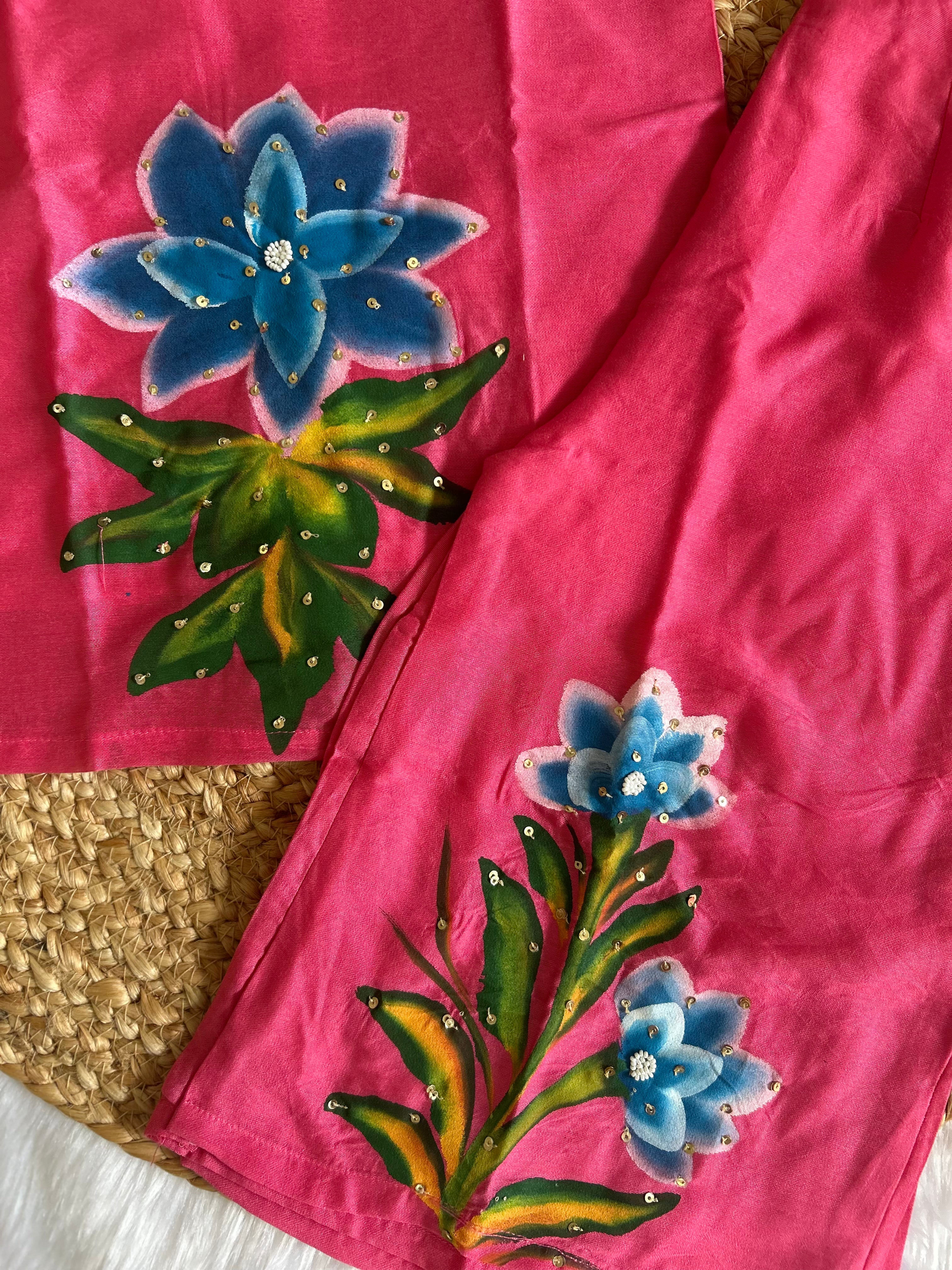 Celebrate the spirit of festivals with this exquisite hand-painted co-ord set designed especially for little trendsetters! Crafted from soft, breathable fabric, this outfit brings together comfort and creativity in the most artistic way. Each piece is lovingly hand-painted by skilled artisans, making every set truly one-of-a-kind.